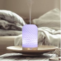 Elegantiškas eterinių aliejų difuzorius su stikliniu gaubtu ir spalvotu apšvietimu.